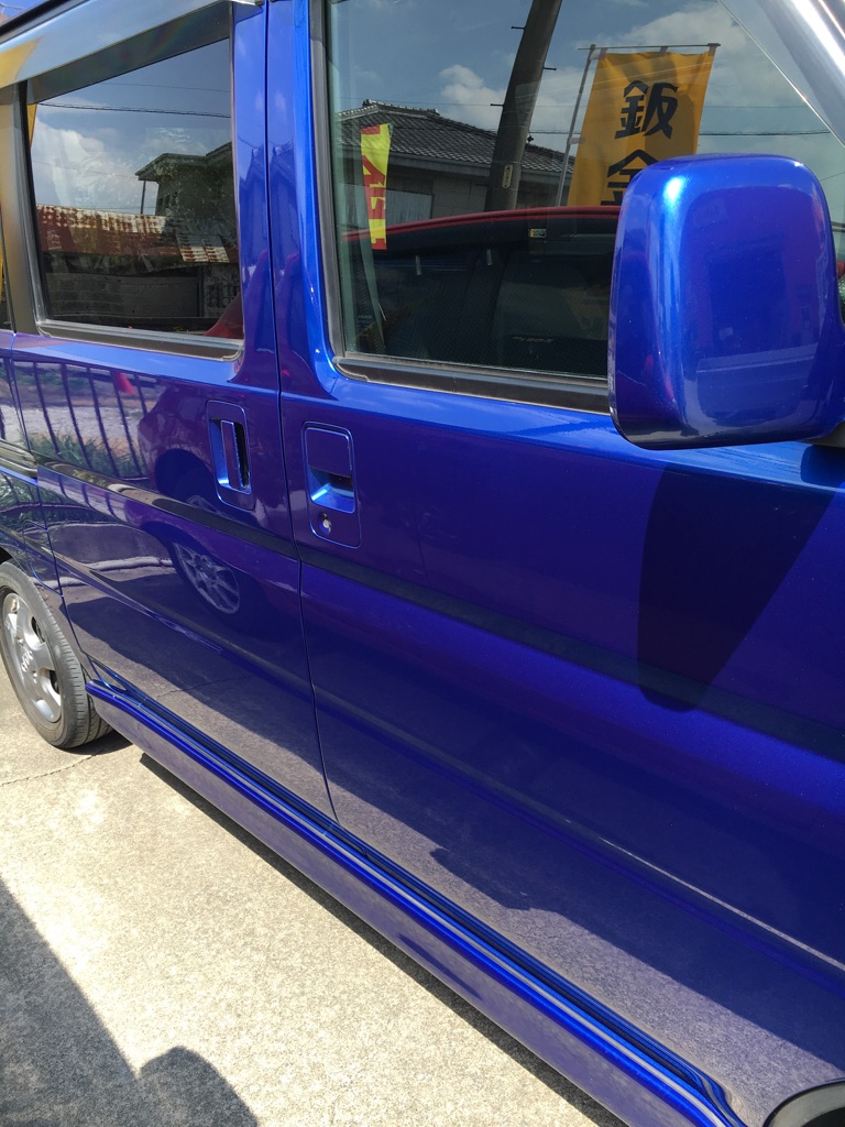通常の見積もりだと、右ドア交換、スライドドア交換、右後ろクオータパネル交換で30万円ぐらいの修理費がかかりますが、お客様のご要望で安く直したいとのことで、頑張りました。